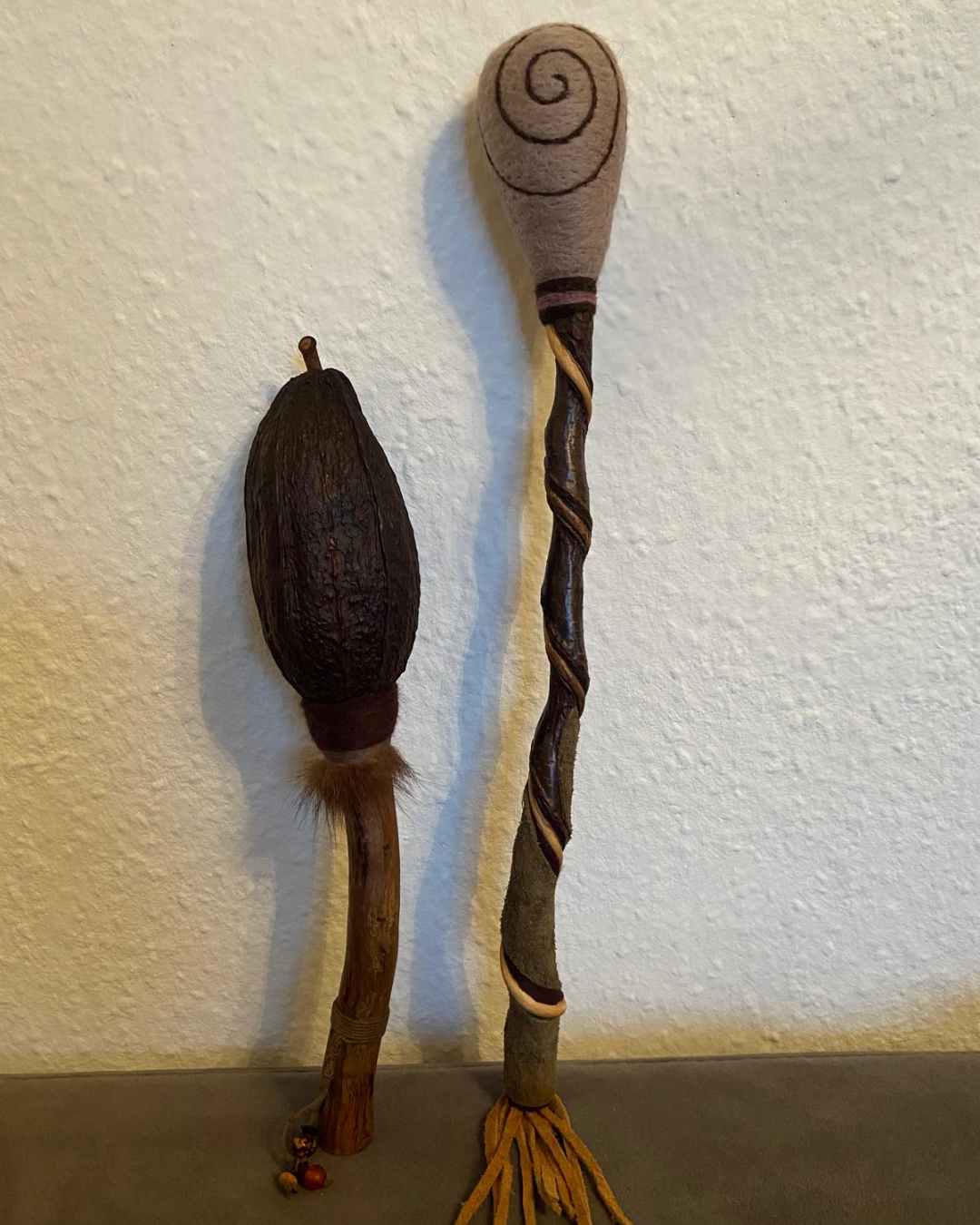 Besonders wichtig ist mir ein respektvoller, nachhaltiger Umgang mit Materialien. Ich verwende Naturmaterialien aus dem Wald, vor dem ich wohne, oder bringe energetisch hochschwingende Fundstücke von besonderen Orten meiner Reisen mit. Wann immer möglich, arbeite ich mit Reststücken, recycelten Materialien oder Häuten, die ich aus zweiter Hand oder in bewusster Auswahl beziehe.